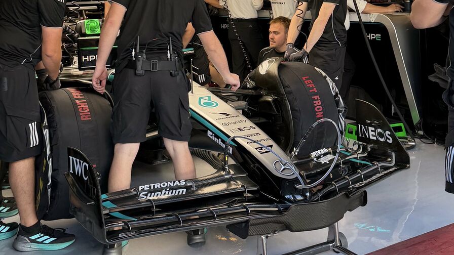 Переднее крыло Mercedes сразу привлекло внимание — конструкция позволяет значительно снижать сопротивление на прямых и имитировать новую конфигурацию крыла. Команда использует эту концепцию для более точного воспроизведения уровня прижимной силы 2026 года, а также для повышения точности данных, собираемых вместе с Pirelli.
