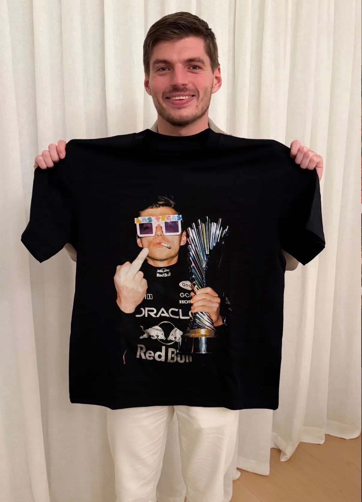 Пике опубликовала фото, на котором Ферстаппен держит чёрную футболку с принтом: на нём изображён он сам в момент празднования победы на Гран При Лас-Вегаса-2025 – с трофеем в руке, поднятым средним пальцем, сигаретой во рту и в ярких очках с надписью Las Vegas.
