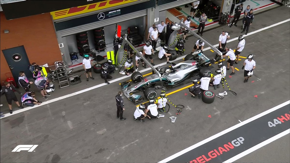 Льюис Хэмилтон и механики Mercedes тренируют пит-стоп.
